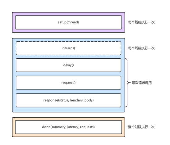 wrk中执行http请求的时候,调用lua分为3个阶段:setup/running/done,每个wrk线程中都有独立的脚本环境. 图片摘抄于:“舒润(博客园)”