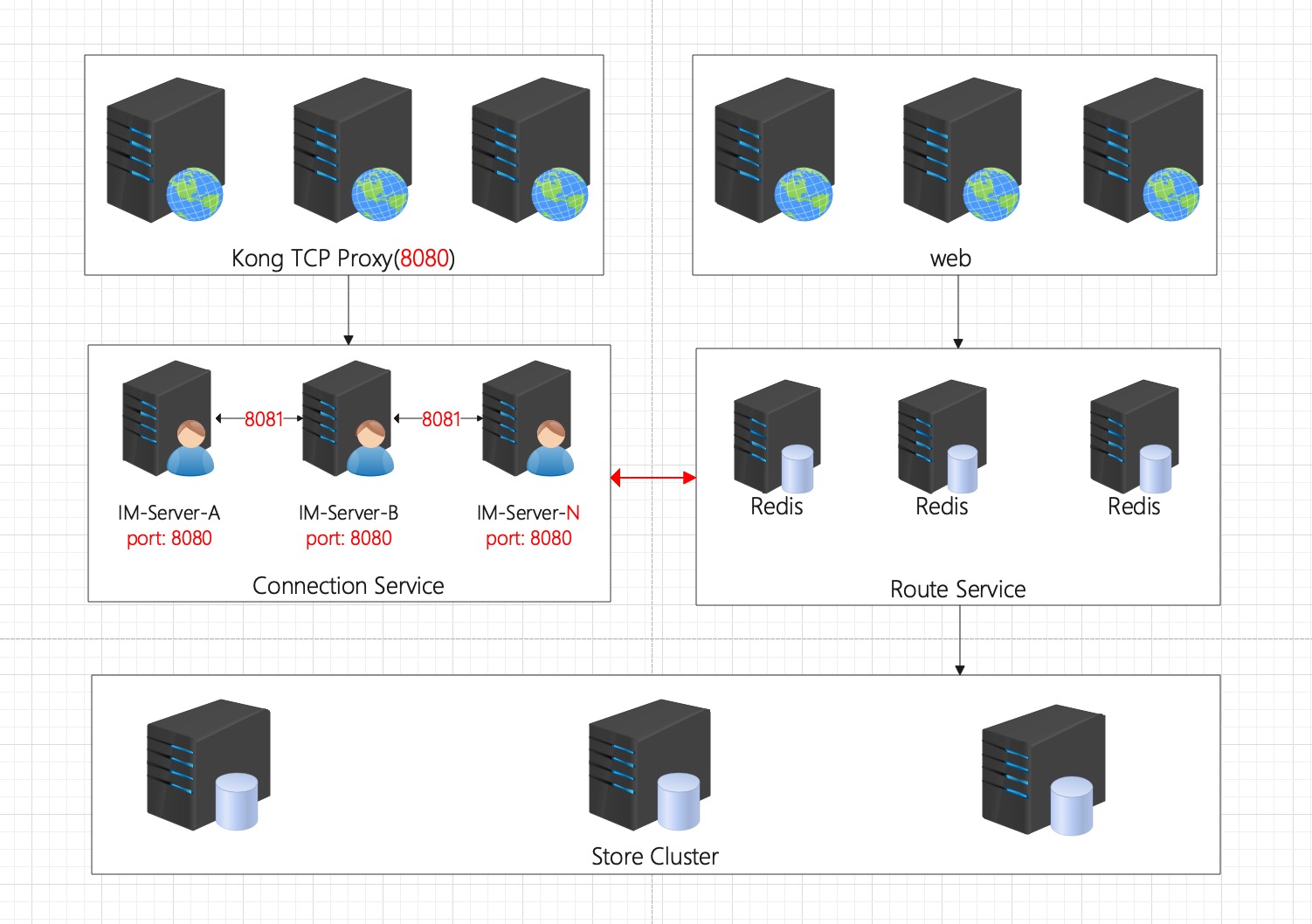 - 监听8081端口,并向Redis注册,同时,并保持与其它Connection Service长连接.